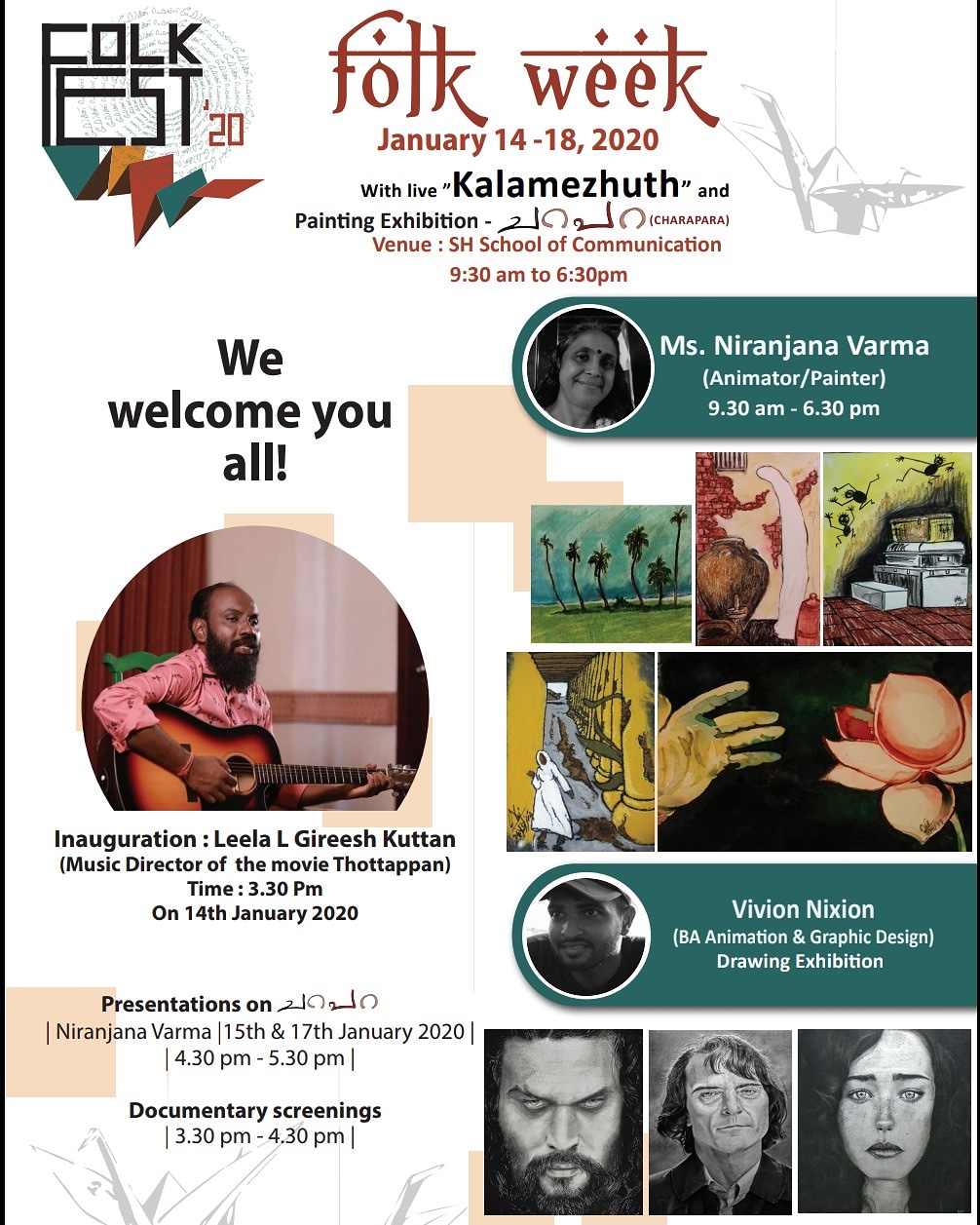 Ms. Niranjana Varma will lead the exhibition and will start the event with live "Kalamezhuthu". It will be a full day process and the exhibition will be after 3.30pm. (Second floor, school of communication. Vivian Nixon's Drawing Exhibition also will be happening side by side. She has drawn a number of images travelling to about 7 locations. She wishes primarily to exhibit it to students and others, in case of any visitors. It does not end there. She will be reproducing number of pictures from the already made collection each day of exhibition following the technique of 'Kalamezhuthu' and each will be erased to make another picture with the same technique one after another.