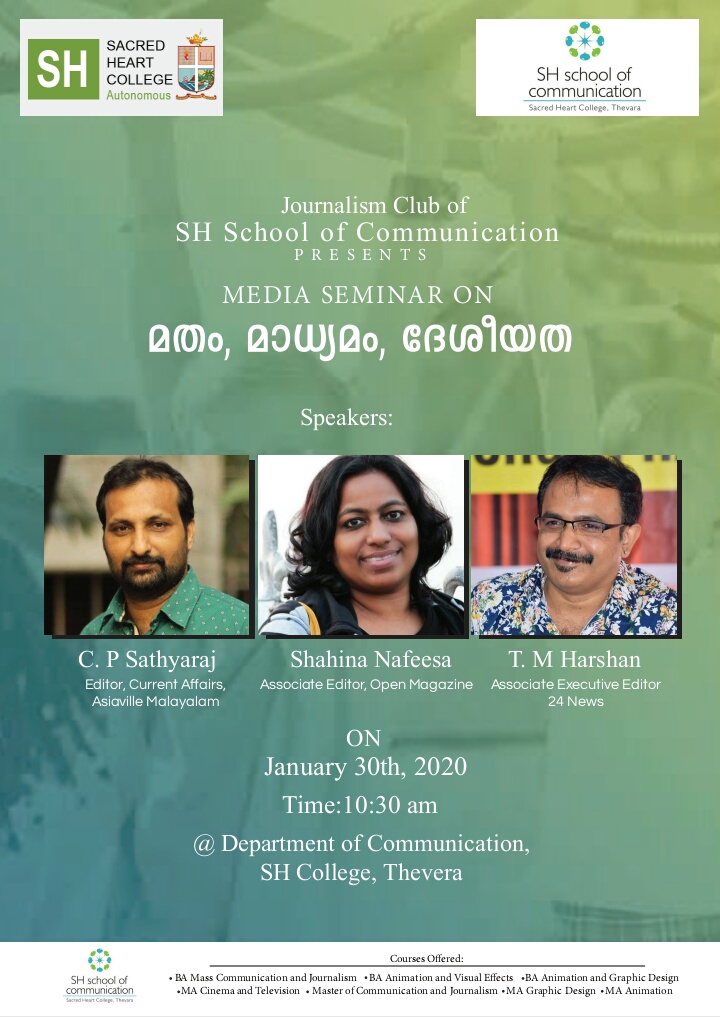 The Journalism Club of SH School of Communication is organising a media seminar on the topic "Religion, Nationalism and Media". The event is planned at Melisius hall. Speakers for the event are Shahina Nafeesa, Associate Editor, Open Magazine, C. P. Sathyaraj, Editor, Current Affairs, Asiaville Malayalam and T. M. Harshan, Associate Executive Editor, 24News.